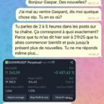 • Ce monsieur promet de multiplier des gain par beaucoup. Même si la personne est dans le rouge et dans la m**de la plus totale. 300€ mise de départ. Je lui ai envoyé 314€ et des poussières par Binance. Il annonce qu’il prendra 20% des gains pour le travail effectué. Il annonce aussi que le courtier prendra 5% lors du retrait. Une fois qu’il a reçu l’argent, il trade pendant quelques heures. Dans mon cas, presque 24h. Puis il envoie des capture écran des pages de trade avec les gains. Il nous félicite (toujours sur Telegram) et nous demande un RIB ou un paypal ou notre numéro de carte pour effectuer le paiement de gains. Il nous dit que l’on peut faire un témoignage vidéo de 20 à 30 seconde pour sa chaîne et que si on accepte, il ne nous facture pas 20% pour son travail mais seulement 15%. Mais tout ça il le veut avant de payer quoi que ce soit. J’ai accepté de faire un témoignage mais à condition de recevoir mes gains d’abord. (Certains on fait le témoignage avant de recevoir quoi que ce soit, d’où le nombre impressionnant de témoignages sur sa chaîne Telegram « investissement avec Gaspard »). Comme j’ai demandé à recevoir mes gains sur Paypal avant de témoigner, il me dit de verser 5% de la somme gagnée au courtier (dans mon cas 551€) et que sans ça il ne peut pas débloquer les fonds. Je lui ai demandé de les retirer directement sur les gains comme c’est annoncé dans sa « marche à suivre ». Il nous dit qu’on a été prévenu d’avance et que c’est donc impossible.